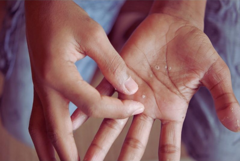 한포진은 손바닥, 발바닥, 손가락 사이에 작은 물집이 생기는 피부 질환이에요. 물집은 작고 투명하며 가렵거나 따가운 느낌을 줄 수 있어요. 이 물집이 터지면 피부가 벗겨지거나 갈라질 수 있답니다. 한포진은 보기에는 무서워 보일 수 있지만, 전염성은 없어요. 그러니까 다른 사람에게 옮길 걱정은 하지 않아도 된답니다!